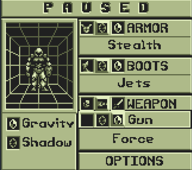 Character can be customized in the pause menu to set how they jump, how their armor works, and how they attack.